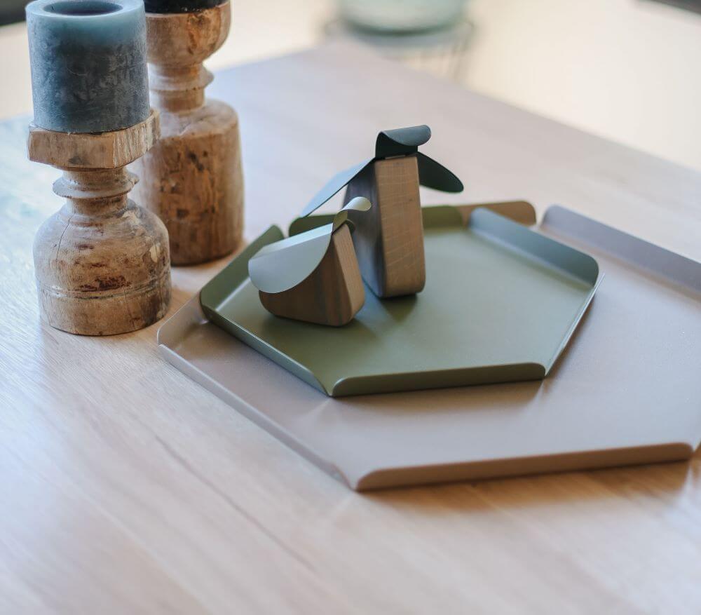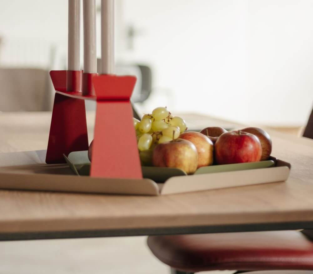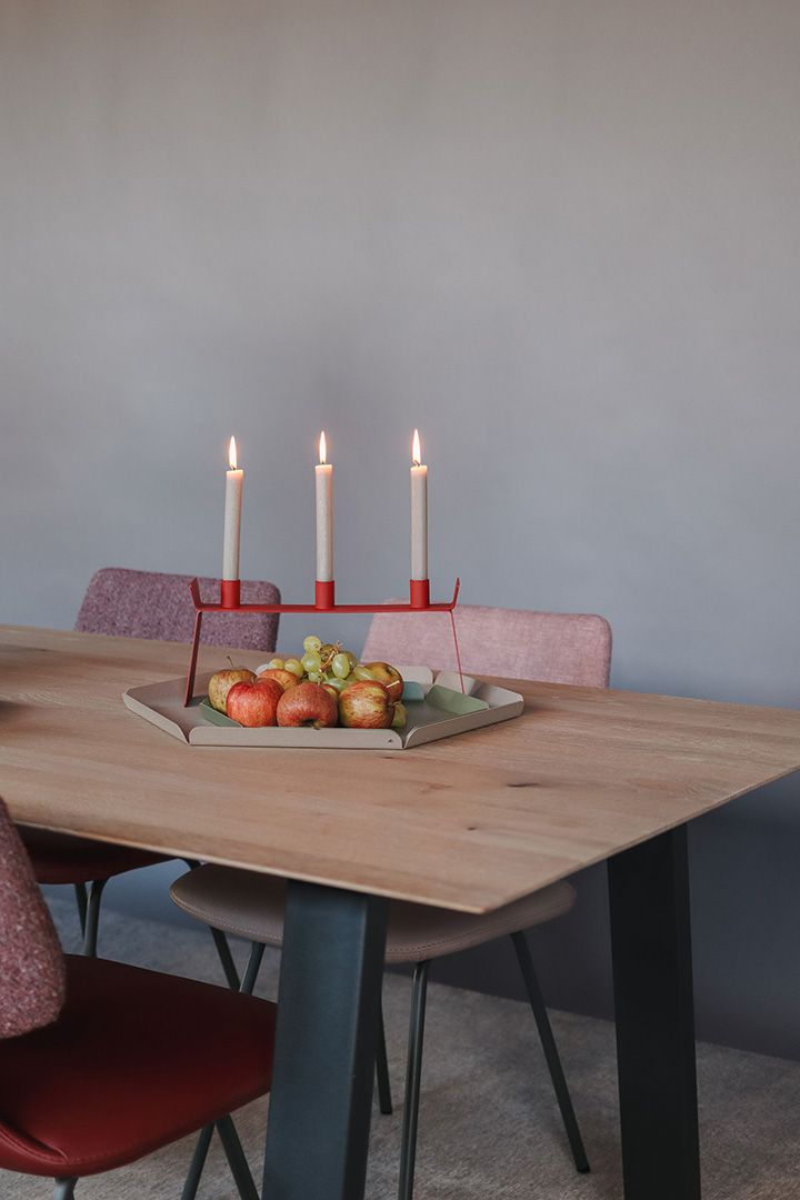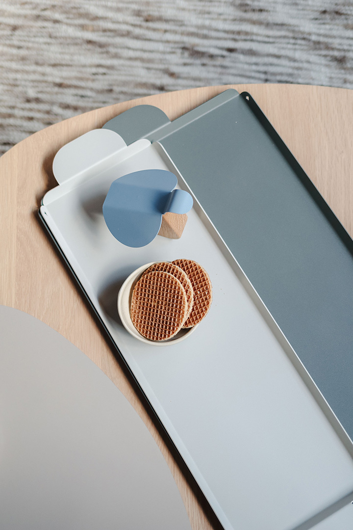 2022 | The young furniture brand ‘They and Me’ asked us to design a set of trays made entirely of steel. They and Me was created from the established brand Bert Plantagie, allowing the younger brand to utilize BP’s production facilities in Europe. One of their techniques is to ‘fold’ steel, which is an enjoyable process for designers who like making scale models and can be easily simulated with paper. Tineke’s love for stationary, such as labels, notepads, tabs, and memo sheets, inspired the design process, which involved cutting, folding, and combining colors. The two sets of trays are based on the beautiful traditional cardboard tabs for ring binders, and their possible color combinations make them very suitable for styling.