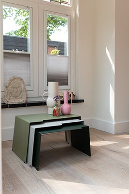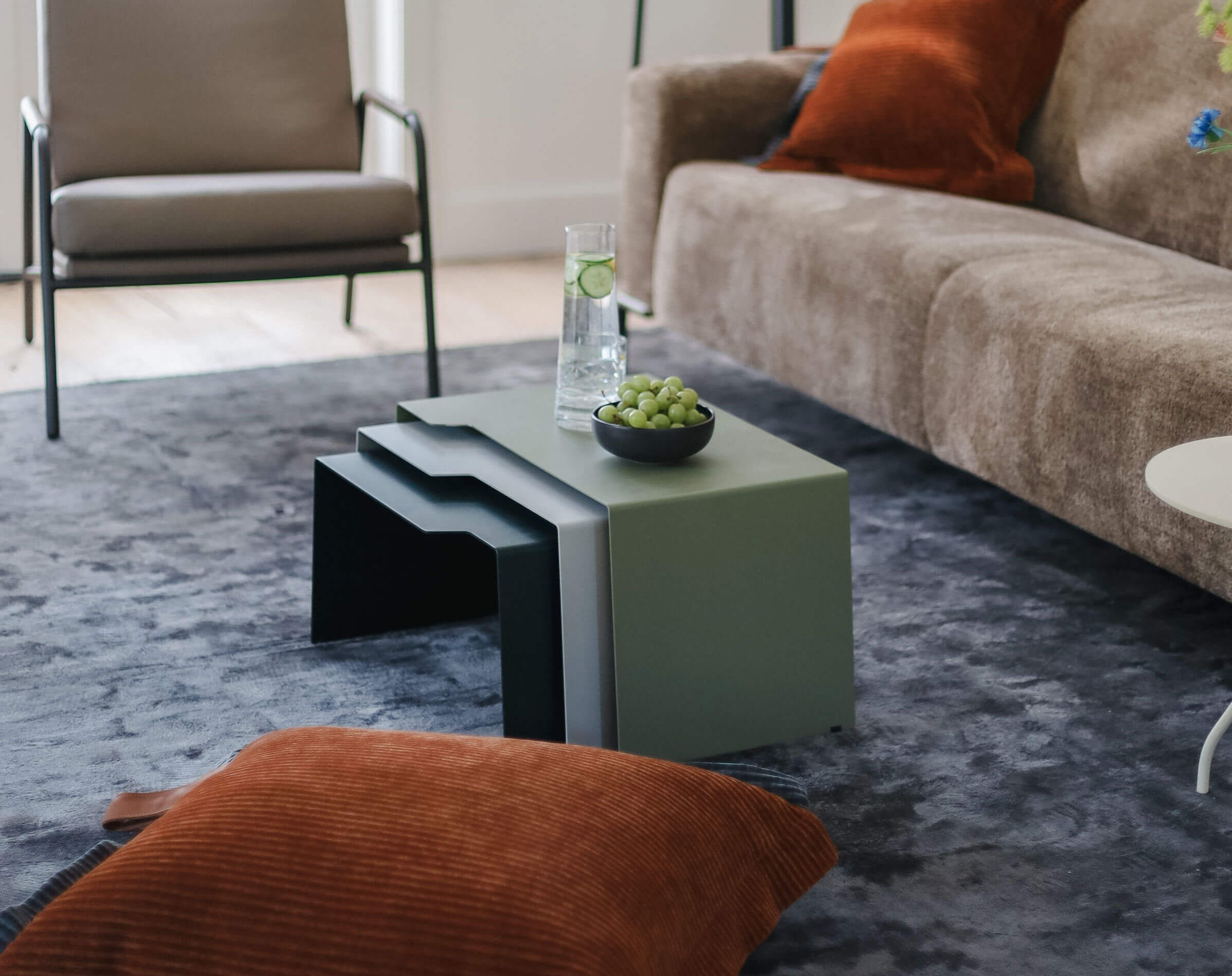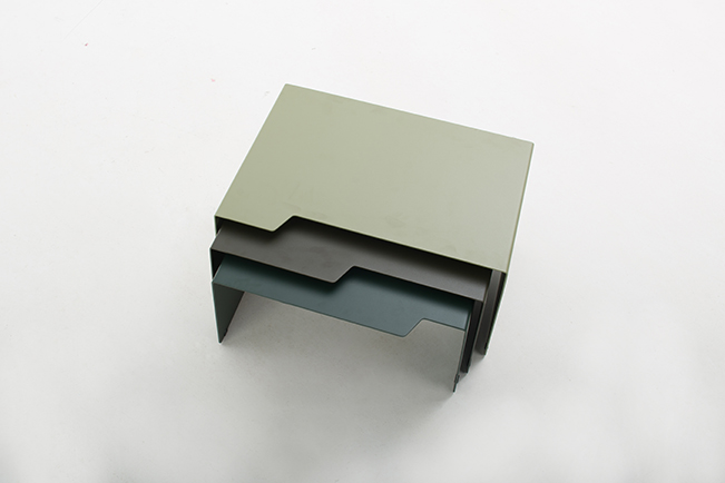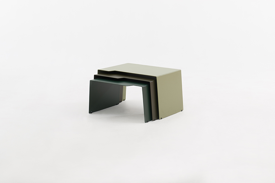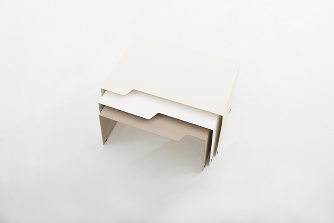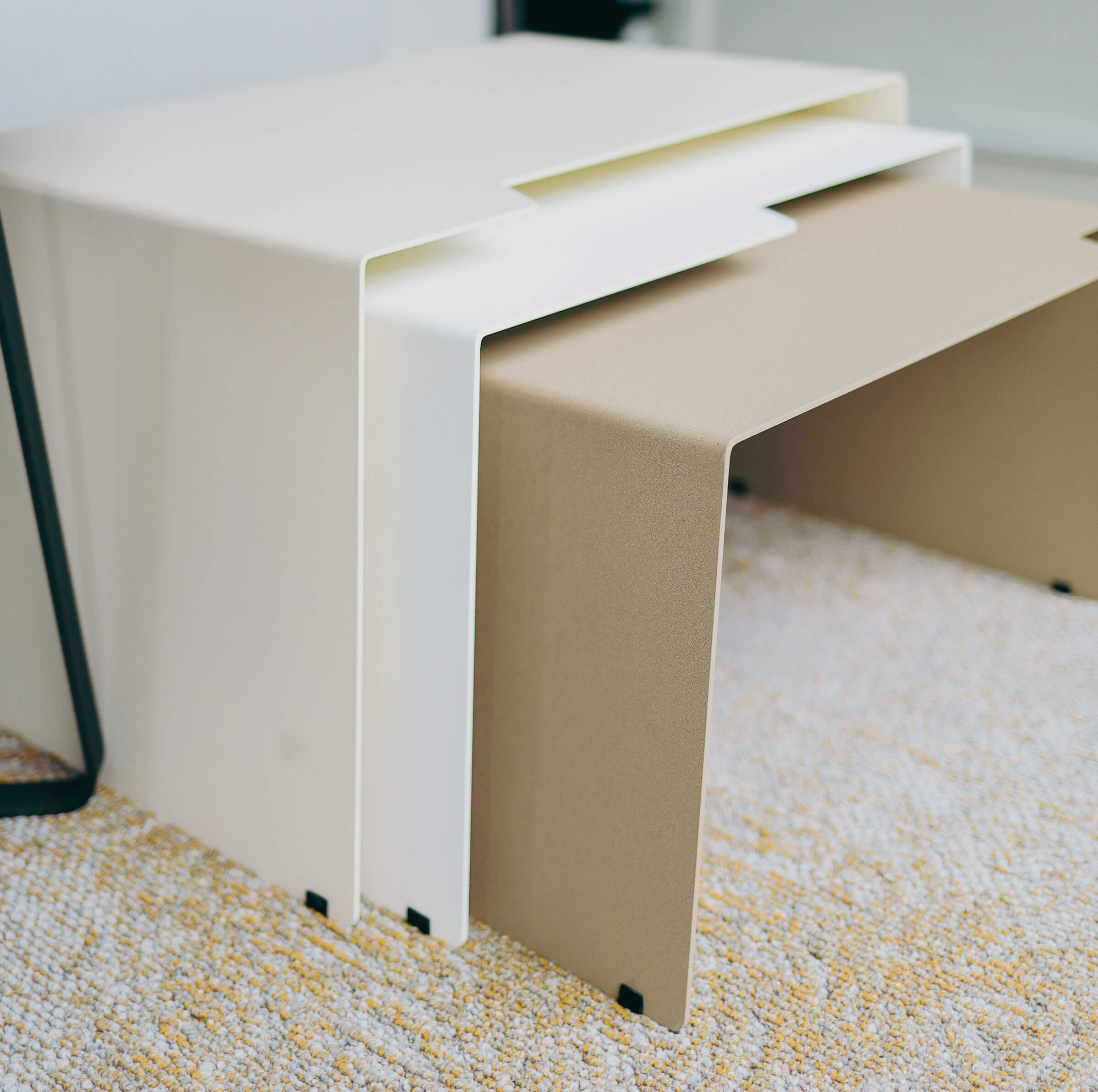 2022 | The young furniture brand ‘They and Me’ asked us to design a set of side tables made entirely of steel. They and Me was created from the established brand Bert Plantagie, allowing the younger brand to utilize BP’s production facilities in Europe. One of their techniques is to ‘fold’ steel, which is an enjoyable process for designers who like making scale models and can be easily simulated with paper. Tineke’s love for stationary, such as labels, notepads, tabs, and memo sheets, inspired the design process, which involved cutting, folding, and combining colors. The set of tables is based on the beautiful traditional cardboard tabs for ring binders, and their possible color combinations make them very suitable for styling.