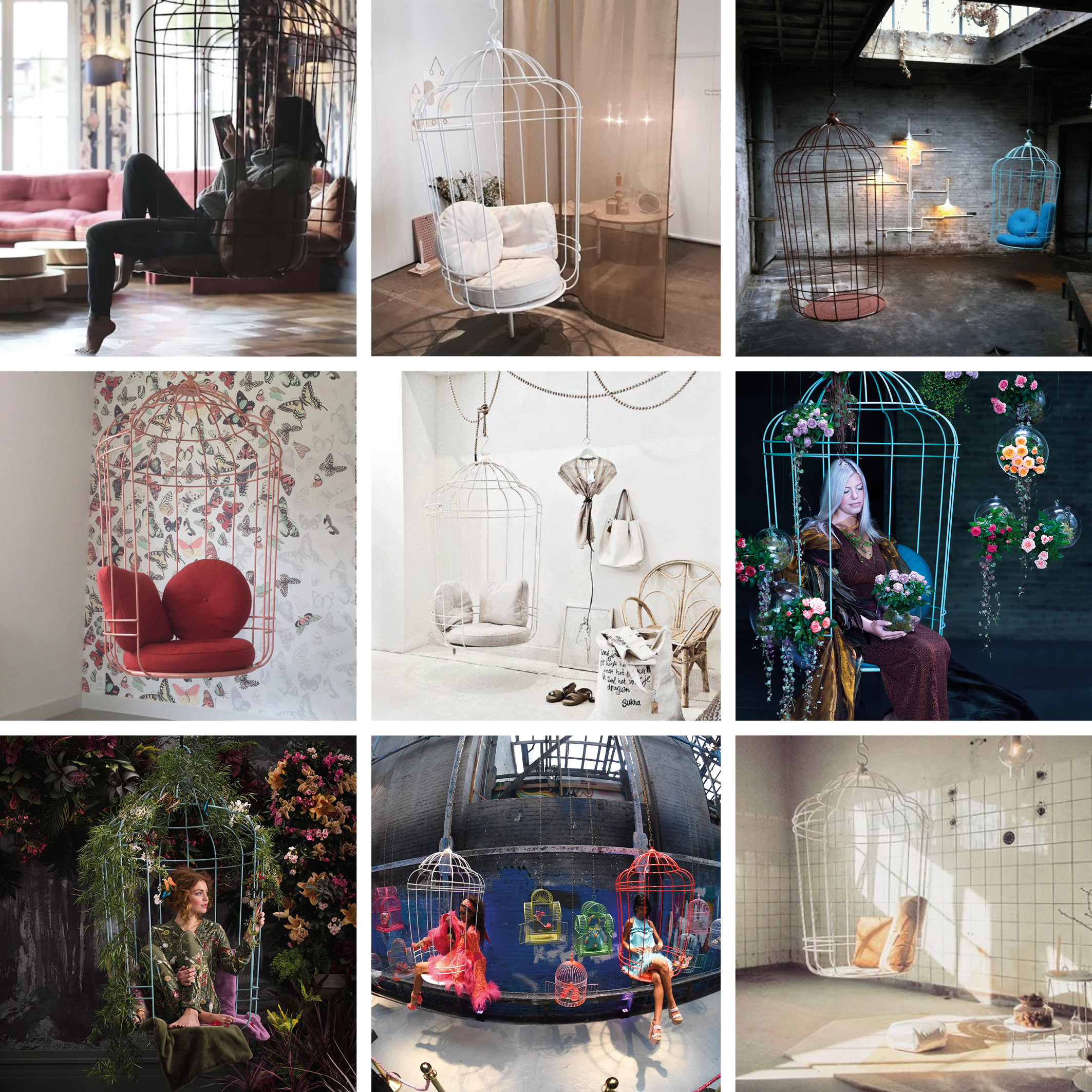 2009 | A birdcage large as life in which you can swing freely: dreaming away in your own space, without being isolated from your surroundings. Not captured, yet safe – and as free as a bird possibly can be. For in- and outdoors, both versions have a hard-as-nails weatherproof coating. Cageling offers peace and quiet hanging from a branch or on a porch, an eye catcher in any interior or shop window. Available in any colour you wish.